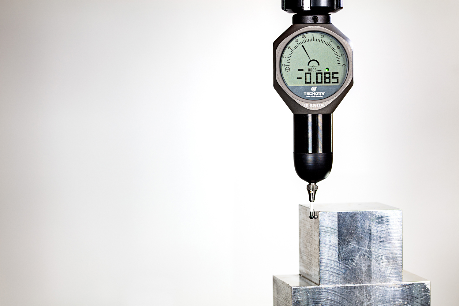 Brandneu und revolutionär ist unser neuer 3D Taster namens 3D Digital. Er vereint das Beste aus zwei Welten, da das Ablesen der Anzeige des 3D Digital sowohl digital als auch analog möglich ist: die Digitalanzeige mit Zahlen ermöglicht dem Anwender das genaue Ablesen auf 0,005 mm. Eine sich schnell verändernde digitale Anzeige mit den Augen zu verfolgen ist nahezu unmöglich. Doch unsere zusätzliche analoge Anzeige gibt dem Anwender Sicherheit. Zudem zeigt eine eingebaute LED dem Anwender den Status des Antastvorgangs mithilfe verschiedener Farben an.