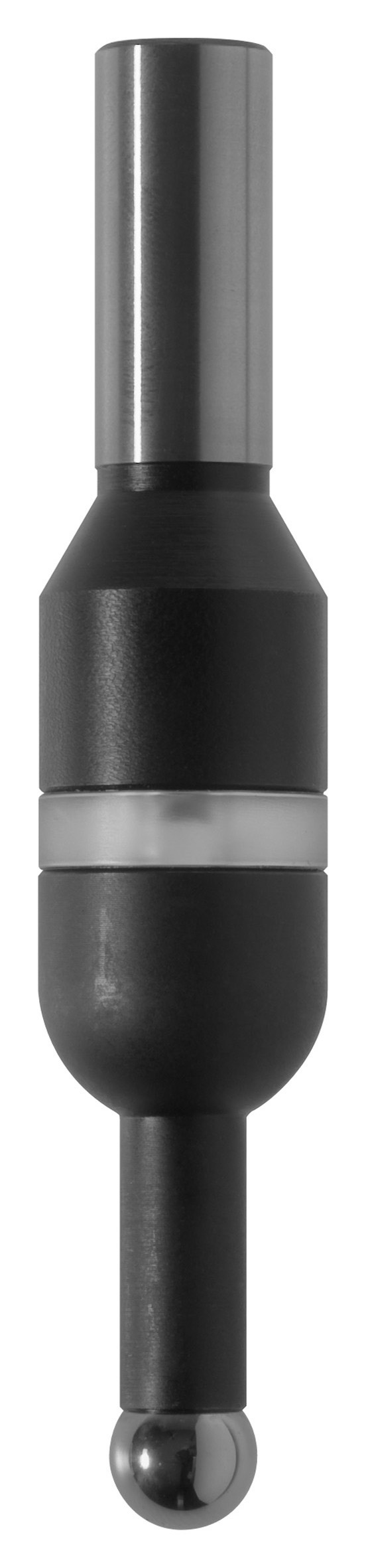 Bei Kontakt der in den Achsen X und Y ausfedernden Tastkugel mit dem elektrisch leitfähigen Werkstück wird der Stromkreis geschlossen und die eingebaute LED leuchtet auf. Somit ist die Werkstückkante bei Aufl euchten der LED mit einem Abstand von 5 mm (= Radius der Tastkugel Ø10) erreicht.