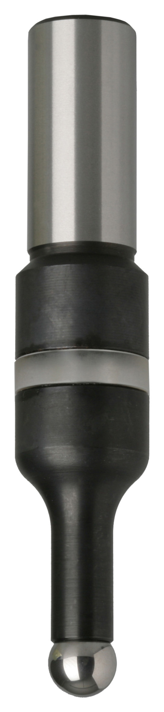 Bei Kontakt der in den Achsen X und Y ausfedernden Tastkugel mit dem elektrisch leitfähigen Werkstück wird der Stromkreis geschlossen und die eingebaute LED leuchtet auf. Somit ist die Werkstückkante bei Aufl euchten der LED mit einem Abstand von 5 mm (= Radius der Tastkugel Ø10) erreicht.